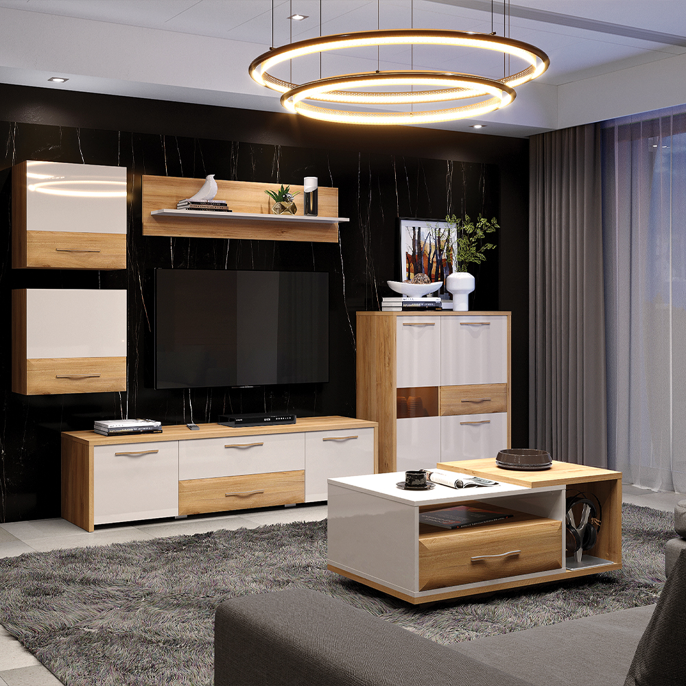 • Плочата на масата е во комбинација од UV лак со висок сјај во беж боја и дрво-декор Пацифик орев;